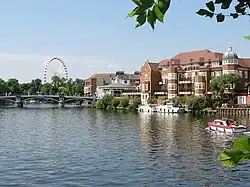 This practice continued until 1845 when a scholar refused to associate with the inns because they were a "temptation" to Eton students.[5] Eton was favourably modernised and was the first village in the UK to have its own post office and modern drainage system.[11] By 1925 the town was described as more commercial than residential, with most of the buildings (apart from those of the school itself) belonging to businesses serving the schoolboys.[5] In April 1970, Windsor Bridge, connecting Eton to Windsor, was closed to all motorised traffic. All traffic must now travel via Royal Windsor Way (formerly the Windsor and Eton relief road),[12] a bypass opened in 1966.