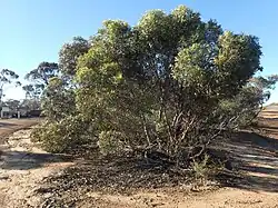 Green mallet often grows in pure stands of open forest on breakaways, rarely on flat ground. It occurs between Ongerup, Ravensthorpe and Lake Magenta in the Esperance Plains and Mallee biogeographic regions.[4][5]