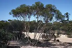 White mallee is found on sandplains on the south western Goldfields-Esperance, Wheatbelt and Great Southern regions of Western Australia growing in mallee shrubland in sandy or clay sand soils with lateritic gravel.[2][5]