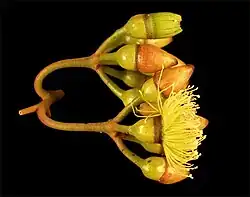 Eucalyptus dielsii, commonly known as the cap-fruited mallee[2] or cap-fruited mallet[3] is a species of mallet that is endemic to the south-west of Western Australia. It has smooth bark, lance-shaped adult leaves, flower buds in groups of seven, yellow to yellowish green flowers and cylindrical to hemispherical fruit with a flange near the rim.