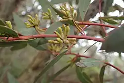 Eucalyptus ecostata is a mallee that typically grows to a height of 6 m (20 ft) and forms a lignotuber. Young plants and coppice regrowth have elliptical, dull green leaves that are up to 30 mm (1.2 in) long and 20 mm (0.79 in) wide. Adult leaves are narrow lance-shaped to lance-shaped, glossy dark green, 70–110 mm (2.8–4.3 in) long and 13–17 mm (0.51–0.67 in) wide. The flower buds are arranged in groups of between eleven and fifteen on a pendulous peduncle 10–15 mm (0.39–0.59 in) long, the individual buds on a pedicel 5–8 mm (0.20–0.31 in) long. Mature buds are yellowish, 13–19 mm (0.51–0.75 in) long and 4–7 mm (0.16–0.28 in) wide with a long, conical operculum that is between two and five times as long as the floral cup. The flowers are creamy white and the fruit is a woody, flattened, more or less hemispherical capsule 6–12 mm (0.24–0.47 in) long and 7–12 mm (0.28–0.47 in) wide with the valves near the level of the rim or slightly beyond it.[3][4][5]