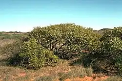 This mallee grows in red sandy soils on sand plains, sand dunes and calcareous hills in open shrubland along the coast of Western Australia from south of Exmouth Gulf to south of Shark Bay.[3][4]