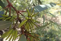Eucalyptus incerata is a mallee that typically grows to a height of 3–12 m (9.8–39.4 ft) and forms a lignotuber. It has smooth, light greyish brown bark. Adult plants have lance-shaped leaves that are the same shade of green on both sides, 50–105 mm (2.0–4.1 in) long and 10–32 mm (0.39–1.26 in) wide on a petiole 5–17 mm (0.20–0.67 in) long. The flower buds are arranged in leaf axils in groups of seven on an unbranched peduncle 15–35 mm (0.59–1.38 in) long, the individual buds on pedicels 7–12 mm (0.28–0.47 in) long. Mature buds are shaped more or less like long, thin spindles, 22–35 mm (0.87–1.38 in) long and 6–9 mm (0.24–0.35 in) wide with an operculum at least twice as long as the floral cup. Flowering has been seen in October and the flowers are creamy yellow. The fruit is a woody barrel-shaped to cup-shaped capsule 10–15 mm (0.39–0.59 in) long and 9–18 mm (0.35–0.71 in) wide with the valves near rim level.[2][3][4]