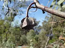 The mallee typically grows to a height of 1.5 to 8 metres (5 to 26 ft) that has rough fibrous bark on the trunk with smooth bark above. It produces white-cream to red-pink flowers between April and October.[1] The flower buds and fruits are large and ribbed or “winged” and are found in pendulous groups of three.[2] It has variable form ranging from a small compact shrub-like habit to a taller more irregular habit. The flowers are highly decorative usually with pink-red buds that open to cream-yellow flowers that are around 3 centimetres (1.2 in) across.[3] The dull, grey-green, thick and concolorous adult leaves have a disjunct arrangement. The leaf blade has a narrow lanceolate to broad lanceolate and is basally tapered. The buds are globose and rostrate, with a calyx calyptrate that sheds early. The fruits are hemispherical with a raised disc and exserted valves.[4][5]