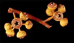 - Eucalyptus leptopoda subsp. subluta L.A.S.Johnson & K.D.Hill[13] usually has only seven flower buds in a group and the disc of the fruit flat or rounded.[9]