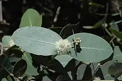 Eucalyptus neglecta is a tree, sometimes a mallee that typically grows to a height of 6–7 m (20–23 ft) and forms a lignotuber. It has smooth grey to brownish bark, but older specimens often have fibrous grey to brown bark on the trunk. The crown of the tree is mostly composed of sessile, juvenile leaves that are arranged in opposite pairs, with some intermediate and adult leaves. Juvenile leaves are greyish green, broadly elliptic to almost round, up to 110 mm (4.3 in) long and 70 mm (2.8 in) wide. Adult leaves are lance-shaped, the same shade of green on both sides, 80–150 mm (3.1–5.9 in) long and 25–35 mm (0.98–1.38 in) wide on a petiole up to 23 mm (0.91 in) long. The flower buds are arranged in leaf axils in groups of between seven and fifteen on an unbranched peduncle up to 5 mm (0.20 in) long, the individual buds sessile. Mature buds are oval, 3–6 mm (0.12–0.24 in) long and 3–5 mm (0.12–0.20 in) wide with a conical to rounded operculum. Flowering occurs between November and February and the flowers are white. The fruit is a woody, cup-shaped or conical capsule 3–4 mm (0.12–0.16 in) long and 4–7 mm (0.16–0.28 in) wide with the valves near rim level.[3][4][5]