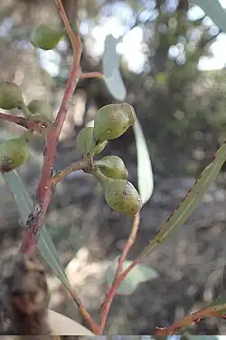 Eucalyptus neutra is a mallee that typically grows to a height of 4–6 m (13–20 ft) and forms a lignotuber. The bark is smooth cream-coloured to tan and peels in short strips to reveal salmon pink to copper-coloured new bark. Young plants and coppice regrowth have egg-shaped to lance-shaped leaves that are 35–80 mm (1.4–3.1 in) long and 18–40 mm (0.71–1.57 in) wide and glaucous. Adult leaves are arranged alternately, lance-shaped, the same shade of dull blish green on both sides, 50–110 mm (2.0–4.3 in) long and 10–20 mm (0.39–0.79 in) wide on a petiole 10–20 mm (0.39–0.79 in) long. The flower buds are arranged in leaf axils, usually in groups of seven, on an unbranched peduncle 5–13 mm (0.20–0.51 in) long, the individual buds on pedicels 3–6 mm (0.12–0.24 in) long. Mature buds are glaucous, oval, 11–17 mm (0.43–0.67 in) long and 3–6 mm (0.12–0.24 in) wide with a beaked to horn-shaped operculum. Flowering occurs on November and February and the flowers are pale yellow to white. The fruit is a woody, barrel-shaped to shortened spherical capsule 5–10 mm (0.20–0.39 in) long and 5–8 mm (0.20–0.31 in) wide with the valves protruding strongly above the rim.[2][3]