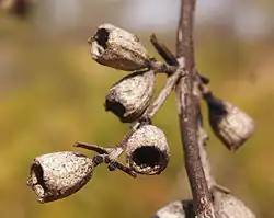 The species was first formally described by the botanist Ferdinand von Mueller in 1859 in the work Monograph of the Eucalypti of tropical Australia as published in the Journal of the Proceedings of the Linnean Society, Botany.[8] The type specimen was collected by von Mueller from along Sturt's Creek in the Northern Territory in 1856.[6] The species name is derived from ancient Greek and means "tooth-fruited" and refers to the four teeth found around the rim of the fruit.[5][9] E. odontocarpa is very similar to E. gamophylla, but E. gamophylla is easily separated by its mature crown of broader leaves with an opposite arrangement.[5]