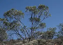 Sharp-capped mallee grows in open shrubland in undulating sand and on sand dunes in the central Australian ranges of the far east of Western Australian, south-western Northern Territory and north-western South Australia.[4]