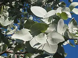 Eucalyptus pruinosa, commonly known as silver box, silver leaf box, apple box or smoke tree,[2] is a species of tree or a mallee that is endemic to northern Australia. The Jaminjung peoples know the tree as yarrirra or jarnbiny, the Jaru as wararn and the Wagiman as wararn.[2] It has rough, fibrous to flaky bark on the trunk and branches, a crown composed of juvenile, glaucous, heart-shaped to broadly elliptical leaves arranged in opposite pairs, flower buds arranged in groups of seven on the ends of branches, creamy white to pale yellow flowers and cylindrical to conical fruit.