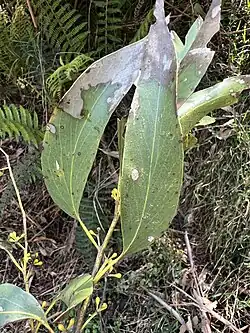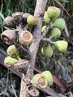 Genome-wide sequencing of numerous mountain ash populations suggests that hybridisation with messmate (Eucalyptus obliqua) occurs frequently, with all populations currently studied having at least one hybrid individual present.[17][15] In many cases these hybrids show no obvious morphological signs of hybridisation, although some individuals do show intermediate phenotypes in characteristics such as the oil gland density in leaves and the structure and height of rough bark on the trunk.[19] Morphology is generally now considered to be a poor method of identifying hybrid individuals as it does not always accurately reflect the genetic makeup of an individual.[20][21] A good example of this is a population of purported mountain ash on Wilson's Promontory in Victoria, which are morphologically more similar to mountain ash but genetically much more closely related to messmate.[17] Other populations with high levels of hybridisation include those on Bruny Island and the Tasman Peninsula in Tasmania.[17] It is not surprising that the populations with the highest level of hybridisation occur on islands, promontories and peninsulas, as these areas are likely to occur on the edge of the ecological niche of mountain ash, and the small patches of mountain ash still remaining at these sites are probably experiencing pollen swamping from the more dominant messmate trees.[22][17] Hybrids between mountain ash and red stringybark (Eucalyptus macrorhyncha) have been observed in the Cathedral Range in Victoria.[19] These trees resemble mountain ash in appearance though they lack the paired inflorescences, and have the oil composition of red stringybark.[19]