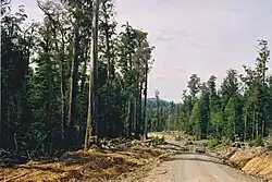 A very tall mountain ash by a logging road. Trees that have been identified as above the permissible height for logging are left isolated when the forest around them is logged. If reduced in height by storm, the tree becomes loggable.