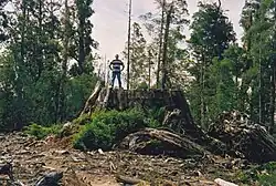 The stump of one of the largest Eucalyptus regnans to be logged in Tasmania. The man is 1.86 m (6 ft 1 in).