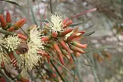 The species grows in woodland communities with an understorey that contains a variety of melaleuca species including M. acuminata, M. pauperiflora, M. lateriflora, M. brophyi and M. uncinata group. Other associated species include Bossiaea halophila, Gahnia ancistrophylla and Brachyscome lineariloba, all well suited to calcareous, saline low-lying areas.[11]