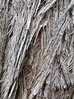 Eucalyptus tenella is a tree that typically grows to a height of 15 m (49 ft) and forms a lignotuber. It has thick, fibrous, furrowed, stringy bark usually coloured grey over reddish brown. Young plants and coppice regrowth have glossy green leaves that a paler on the lower surface, narrow lance-shaped to linear, 25–70 mm (0.98–2.76 in) long and 3–15 mm (0.12–0.59 in) wide. Adult leaves are narrow lance-shaped to linear or curved, 50–150 mm (2.0–5.9 in) long and 5–20 mm (0.20–0.79 in) wide on a petiole 3–15 mm (0.12–0.59 in) long. The flower buds are arranged in leaf axils in groups of seven to fifteen on an unbranched peduncle 4–10 mm (0.16–0.39 in) long, the individual buds sessile or on pedicels up to 3 mm (0.12 in) long. Mature buds are oval to spindle-shaped, 4–60 mm (0.16–2.36 in) long and 2–3 mm (0.079–0.118 in) wide with a conical to rounded operculum. Flowering occurs from September to March and the flowers are white. The fruit is a woody spherical or hemispherical capsule 5–6 mm (0.20–0.24 in) long and 5–7 mm (0.20–0.28 in) wide with the valves near rim level.[2][3][4]