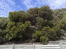 Coastal moort is found along the west and south coast of Western Australia, as far north as around Perth with the bulk of the population between Fitzgerald River National Park then east to around Esperance with scattered populations found further east. Populations are also found on islands in the Recherche Archipelago including Middle and Mondrain Island. It grows in a variety of habitats, including on sand dunes, on and around granite hills, and near swamps and estuaries, growing in sandy or clay soils. It is native in parts of its range and naturalised elsewhere.[2][4]