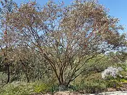 Eucalyptus websteriana, commonly known as Webster's mallee, heart-leaf mallee or dainty mallee,[2] is a species of mallee that is endemic to the Goldfields-Esperance region of Western Australia. It has reddish minnirichi bark on the trunk and branches, egg-shaped to heart-shaped adult leaves, flower buds in groups of seven, pale cream-coloured to yellow flowers and usually hemispherical fruit.