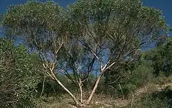 Eucalyptus zopherophloia, commonly known as the blackbutt mallee,[1] is a species of spreading mallee that is endemic to an area on the west coast of Western Australia. It has rough bark over part or all of the trunk, smooth grey bark above, narrow lance-shaped leaves, flower buds in groups of nine or eleven, creamy white flowers and conical fruit.