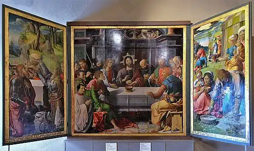 The Eucharist Triptych is an oil on panel painting by Grégoire Guérard, from 1515, commissioned for Autun Cathedral. The central panel shows the Last Supper, with the wings showing Abram meeting Melchizedek and the fall of the manna. On the reverse of the wings are grisaille images of the Madonna and Child and of John the Baptist. It was made a monument historique on 1 June 1907 and is now in the Musée Rolin, also in Autun.[1]