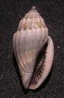 The oblong shell has a short spire and is a little turreted. The whorls are rounded at the upper part and longitudinally closely ribbed. The outer lip is more than usually thickened. The shell has a lead color or is banded with lead color, crossed with numerous obscure fine white lines.[3]