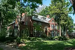 St. James Parkway was the first street Deming platted. Eighteen of the 22 homes built in Euclid Golf Allotment in the 1910s were constructed on North St. James.[56] West St. James Parkway was the next to be developed. Deming was frustrated by the existence of Roxboro Elementary School and Roxboro Junior High School on the south side of the western half of West St. James Parkway, and by several low-quality duplexes on the south side of the eastern half of West St. James. To protect the Euclid Golf Allotment, Deming contracted with Howell & Thomas to design 14 cottages for construction on the north side of West St. James to screen these low-quality homes from the rest of the development. These were built in the 1910s, with four more in the 1920s. Ten of the 18 houses were in the Colonial Revival style.[58] Deming even purchased three of the remaining lots on the south side of West St. James and built high-quality cottages (2600, 2594, and 2580-2582 West St. James Parkway) to provide an additional screen for the Euclid Golf Development.[59]