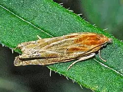 Eucosma cana can reach a body length of about 11.5 mm (0.45 in) and a wingspan of 16–23 mm.[4] The head of these moths is reddish brown, while the thorax is light brownish on the sides, dark brownish in the middle. The ground colour of the forewings is light brown or greyish, with light longitudinal discal streaks. The edges are feathered. The hindwings are dark gray toward the margins. This species in rather similar to Eucosma hohenwartiana,[4] which has a darker ground colour of the forewings, lacking the longitudinal lighter streaks. Meyrick describes it -The forewings are elongate, fold reaching to near middle; ochreous, somewhat blackish -sprinkled, with several suffused ochreous whitish longitudinal streaks confluent in middle towards base, ceasing before very narrow central fascia of ground-colour; an oblique wedge-shaped ferruginous suffusion from dorsum near base; posterior half of costa with very oblique whitish strigulae, abruptly ceasing at 1/3; ocellus metallic-edged, containing one or two incomplete black dashes; termen sinuate. Hindwings in male pale grey, darker terminally, in female darker. The larva is dull pink; head and plate of 2 brown.[5]