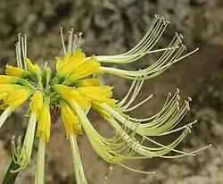 All the members of the genus are bulbous. The leaves are deciduous, with characteristic long petioles and elliptical or ovate blades (laminae), up to 25 cm wide; they may or may not be present when the flowers are produced. The inflorescence is an umbel of 6–30 weakly to strongly zygomorphic flowers, tubular at the base, green, yellow or red in colour. The stamens hang downwards (i.e. are declinate) and have long filaments which in most species form a cup containing nectaries at the base. The flowers are assumed to be adapted for butterfly pollination, although there is one report of a hummingbird visiting E. eucrosioides. The fruit is a capsule with three locules; the seeds are flattened and winged. The diploid chromosome number is most commonly 2n=46.[6][7]