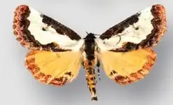 Adults are on wing in spring and summer. Forewings are white with dark brown markings and reddish brown margins, and hindwings are yellow with brown margins. Females' forewings reach 16–17 millimetres (0.63–0.67 in), and males' forewings reach 15–16 millimetres (0.59–0.63 in).[2]