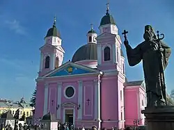 Statue of Metropolitan Eugene in front of the Chernivtsi Metropolitan Cathedral