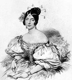 Eugenia Tadolini (née Savorani) (July 9, 1808 – 11 July 1872)[1] was an Italian operatic soprano. Admired for the beauty of her voice and stage presence, she was one of Donizetti's favourite singers.[2] During her career she created over 20 leading roles, including the title roles in Donizetti's Linda di Chamounix and Maria di Rohan and Verdi's Alzira. She was born in Forlì and studied music there and in Bologna before making her debut in Florence in 1828. She sang in all of Italy's leading opera houses, as well as in Paris, Vienna, and London before retiring from the stage in 1852. She spent her remaining years first in Naples, where she had been the Teatro San Carlo's reigning prima donna for many years, and then in Paris, where she died of typhoid fever at the age of 63. From 1827 to 1834, she was married to the Italian composer and singing teacher, Giovanni Tadolini.