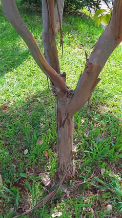The adult tree is 3–6 m (9.8–19.7 ft) tall,[3] with rounded or conical canopy up to 2 m (6.6 ft) wide. New leaves are rusty-brown, turning yellow and then deep dark green. The reddish-brown bark peels off naturally showing a smooth reddish trunk. Leaves are simple, in opposite pairs, with smooth leathery texture, smooth edges, and the apex curved downwards.