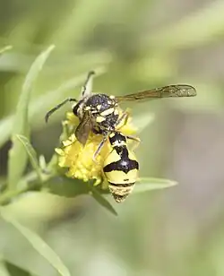 Eumenes crucifera, also known as the cross potter wasp, is a North American species of potter wasp found in Canada, the United States, and Mexico.[1] E. crucifera has a "range of variation mainly in coloration".[2] In part due to this phenotypic variation, there were previously four recognized subspecies, one of which (Eumenes flavitinctus) has been elevated to full species status, and three of which have been eliminated and upmerged back into E. crucifera as of 2018.[2]