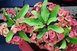 The flowers are small, subtended by a pair of conspicuous petal-like bracts, variably red, pink or white, up to 12 mm (0.47 in) broad.[6] The plant thrives between spring and summer but produces flowers all year round. Extrafloral nectaries at the involucre were first reported on E. milii by Teng and Hu 2002.[7]