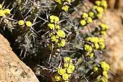 Bright yellow, glabrous flowers or cyathia some 3mm in diameter appear in threes on short cymes near the upper end of branches. They have 5 glands and 5 broadly obovate fringed lobes. The ovary is sessile and included in the involucre. Styles are shortly united at the base, and minutely bifid at the apex. The capsule is sessile and partly exserted, about 3mm in diam., and 3-lobed as seen from above. Capsules explode with some force when ripe during the first spring rain, dispersing the seeds. This species is pollinated by insects such as flies, bees and wasps.