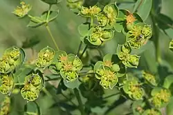 Leafy spurge was transported to the United States possibly as a seed impurity in the early 19th century. It now occurs across much of the northern U.S., with the most extensive infestations reported for Montana, North Dakota, Nebraska, South Dakota, and Wyoming. Since the introduction of leafy spurge to the United States, it has been found in 458 counties in 26 states.[2] It has been identified as a serious weed on a number of national parks and on reserves of The Nature Conservancy in eleven northern states. It is now classified as an invasive species by the United States Department of Agriculture.[3][4]