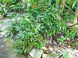 Eupomatia barbata is a bushy compact shrub growing to about 1 m (3 ft 3 in) tall. The leaves are arranged alternately on the twigs, and the twigs form a zig-zag pattern from one leaf to the next. The petioles (leaf stalks) are 4 to 6 mm (0.16 to 0.24 in) long with narrow wings that extend along the twigs to the next-lower leaf. The leaf blades are glabrous, up to 20 cm (7.9 in) long by 6 cm (2.4 in) wide, and oblanceolate in shape with a drip tip. They have 16–22 pairs of lateral veins that form distinct loops inside the margin of the leaf.[4][5][6][7]