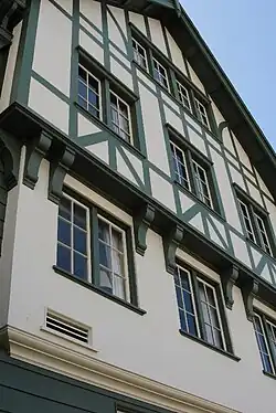 Architectural details include the use of differing roof forms and "visually stunning textured elevations", which are highlighted by stucco and half-timbering.[7]