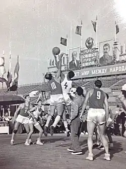 European Cup, Moscow 1953. Zacharia Ofri (#4, Israel) tipping off the ball.