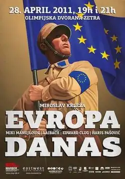 Europe Today is a theatre show produced in cooperation between East West Theatre Company and Slovene National Theatre.[1] The show is based on an essay written by Miroslav Krleza and directed by Haris Pasovic. Production also included Miki Manojlovic, an actor; Edward Clug, a contemporary dancer and choreographer; as well as the industrial, neoclassical band Laibach.[2] The dramaturgy of the production was done by Dubravka Vrgoc, director of Zagreb Youth Theatre. The artists, who reside in Slovenia, Serbia, Bosnia and Herzegovina and Croatia, rehearsed in Maribor's Slovene National Theatre during February 2011. The show opened February 16 and it provoked great regional and international interest.[3]