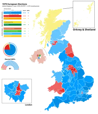 The 1979 European Parliament election, was the first European election to be held in the United Kingdom after the European Communities (EC) decided to directly elect representatives to the European Parliament. It was held on 7 June. Elections were also held in eight other EC states. European elections were incorporated into UK law by the European Assembly Elections Act 1978. Out of the 410 members of the European Parliament, 81 were elected from the UK. The electoral system was First past the post in England, Scotland and Wales (electing 78 MEPs in total) and Single Transferable Vote in Northern Ireland (electing 3 MEPs).