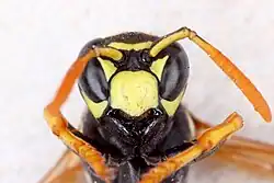 Typically, the alpha female dominates all other individuals of a colony, laying the majority of eggs and partaking in differential oophagy. The alpha female devotes much of her time to social interaction, in comparison to subordinates that are much more involved in foraging and brood care.[39] The clypeus - the yellow region above the mouth, in other words the face - is extremely variable in number, size, and shape of black spots, and this variation correlates to dominance; more dominant individuals have more black spots.[40] The arrival at the nest correlates with the dominance hierarchy. Therefore, individuals that join the nest later are seldom dominant.[41]