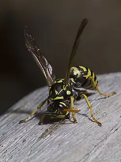 Little variation occurs among individuals of P. dominula; the wing lengths of males range from 9.5 to 13.0 millimetres (3⁄8 to 1⁄2 in), while those of females range from 8.5 to 12.0 millimetres (5⁄16 to 1⁄2 in). Its body is colored entirely yellow and black, similar to that of Vespula germanica, one of the most common and defensive wasps in its native range.[6] The female mandible is black and sometimes has a yellow spot. Females have a black subantennal mark that rarely has a pair of small, yellow spots. The female vertex sometimes has a pair of small, yellow spots behind the hind ocelli. Females have yellow, comma-shaped scutal spots.[7]
