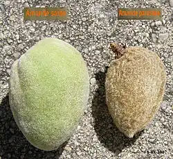 The wasp larvae overwinter within the blackened almond seeds.[3]