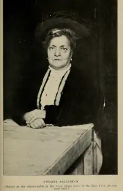 Palladino visited America in 1909 with Hereward Carrington as her manager.[9] Her arrival was publicized by the American press, with newspapers such as the New York Times and magazines such as the Cosmopolitan publishing numerous articles on the Italian medium.[53]