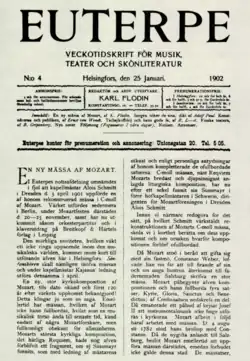 Euterpe was a weekly music, theatre and literary magazine which appeared in Helsinki between 1900 and 1905. It was the first Swedish-language music-oriented magazine published in Finland.[1] Its subtitle was Veckotidskrift for musik, teater och skönlitteratur (Swedish: A weekly magazine for music, theatre and literature).[1]