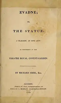 Evadne is an 1819 historical tragedy by the Irish writer Richard Lalor Sheil.[1] It premiered at the Theatre Royal, Covent Garden in London on 10 February 1819.[2] The original cast included Elizabeth O'Neill as Evadne, William Macready as Ludovico, William Abbot as the King of Naples, Charles Mayne Young as Colonna, Charles Kemble as Vicentio, Charles Connor as Spalatro and Harriet Faucit as Olivia. Sheil dedicated the published play to his fellow Irish writer Thomas Moore.