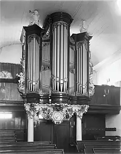 The Lutheran congregation bought the Ververij in 1641, for 4,000 Carolus guilders. Much of the funds were raised from Lutheran communities on the Baltic Sea. The church was likely enlarged in 1667, since there is documentation for building materials worth over 400 Carolus guilders,[1] and by 1718 had between three- and four hundred members.[2] Renovations took place in 1725, and a new parsonage was built. It was renovated again in 1734–35, when a new front gable was placed and a pulpit by Pieter de Nicolo was installed. The purchase of an organ was approved in 1780, and after many delays it was installed in 1782, from the shop of Gideon Thomas Bätz. The organ had ten registers, and cost 1,800 guilders.[1]