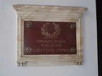 His cousin, Konstantinos Zappas, was the executor of his will and he continued Evangelis Zappas' philanthropic works through his legacy. Zappas's wish was to be initially buried in Romania, where he lived most of his life. But after four years his bones were exhumed and reinterred at the school's courtyard in Labovo where he was born, and his skull was enshrined beneath his memorial statue outside the Zappeion in Athens, Greece. A ceremony for the interment was held at 10am on 20 October 1888 at the Zappeion.[40] Baron Pierre de Coubertin made a similar gesture by having his heart buried at Olympia.[42] In the virtually unpopulated Labovo, there is an old, yet legible, tombstone that states in Albanian: "Here lie the bones of the philanthropist Evangelis Zappas".[54]
