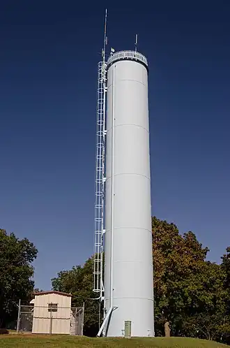 The standpipe (pictured) is a cylinder 80 feet high and 12 feet in diameter, built of curved steel plates from the Chicago Bridge & Iron Company on a poured concrete foundation. It was filled with water from top to bottom, and a standpipe (as opposed to a water tower) worked in Evansville because the hill on which it stood gave it enough pressure to deliver water anywhere in town. A straight steel ladder ascends the west side of the tower. Standpipes were replaced by water towers because they were generally cheaper, and few standpipes were built after 1910.[4]
