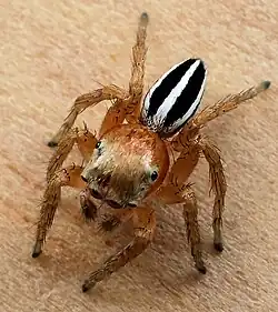 Evarcha striolata is a medium-sized spider with looks that are typical for the genus. It has a body divided into two main parts: a rectangular cephalothorax and thinner, more oval abdomen.[15] The male has a carapace, the hard upper side of the cephalothorax, that is typically 2.1 mm (0.08 in) long and 1.6 mm (0.06 in) wide. Generally rather high with a sharply sloping back. it is generally dark orange and hairless with dark rings around the eyes. There are a few delicate bristles near the front eyes. The underside of the cephalothorax, or sternum, is dark yellow. The spider's clypeus, or face, is low and is decorated with a scattering of delicate hairs. The mouthparts, including the chelicerae, labium and maxillae, are dark yellow.[2]